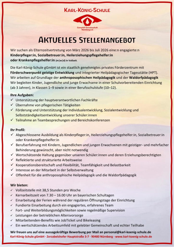 Sonderschullehrer:in – Heilpädagog:in – Heilerziehungspfleger:in – Erzieher:in – Kinderpfleger:in – Heilerziehungspflegehelfer:in – Fachlehrer:in – Waldorflehrer:in mit Zusatzausbildung – Therapeut:in – Verwaltungsmitarbeiter:in – Küchenhilfe – Hausmeister:in – Klassenhelfer:in im Freiwilligen Sozialen Jahr – Vorpraktikant:in zur Berufsausbildung – Berufsanerkennungspraktikant:in – Absolvent:in fachpraktischer Semester – Kurzzeitpraktikant:in