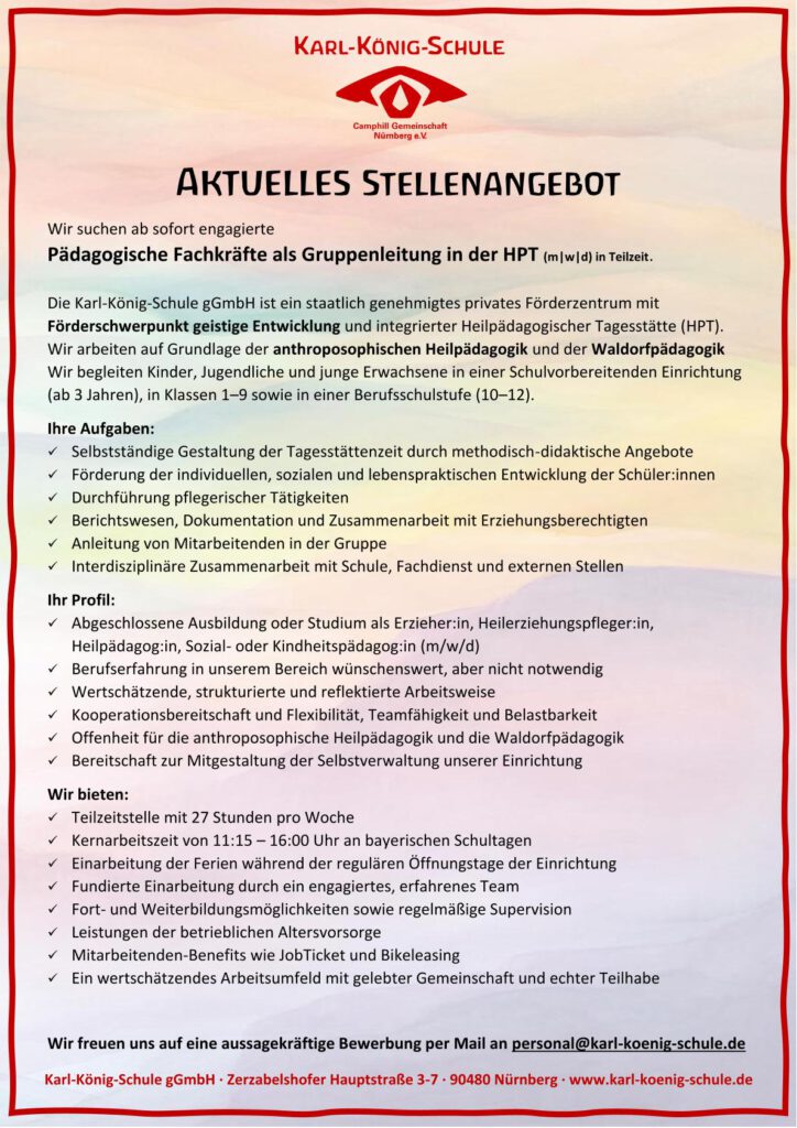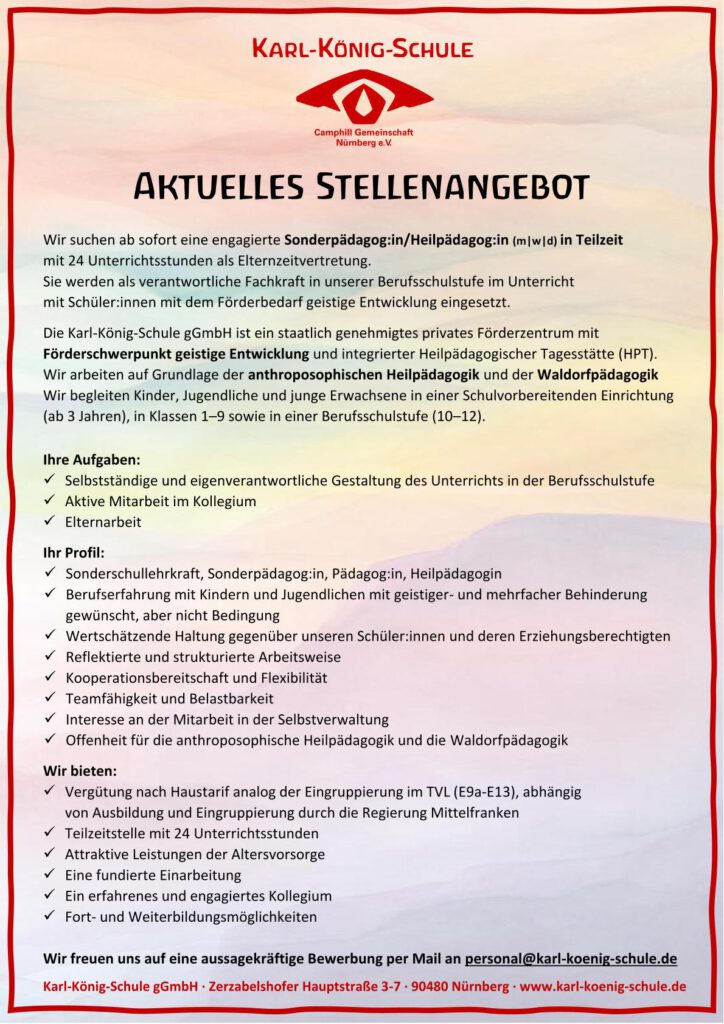 Sonderschullehrer:in – Heilpädagog:in – Heilerziehungspfleger:in – Erzieher:in – Kinderpfleger:in – Heilerziehungspflegehelfer:in – Fachlehrer:in – Waldorflehrer:in mit Zusatzausbildung – Therapeut:in – Verwaltungsmitarbeiter:in – Küchenhilfe – Hausmeister:in – Klassenhelfer:in im Freiwilligen Sozialen Jahr – Vorpraktikant:in zur Berufsausbildung – Berufsanerkennungspraktikant:in – Absolvent:in fachpraktischer Semester – Kurzzeitpraktikant:in