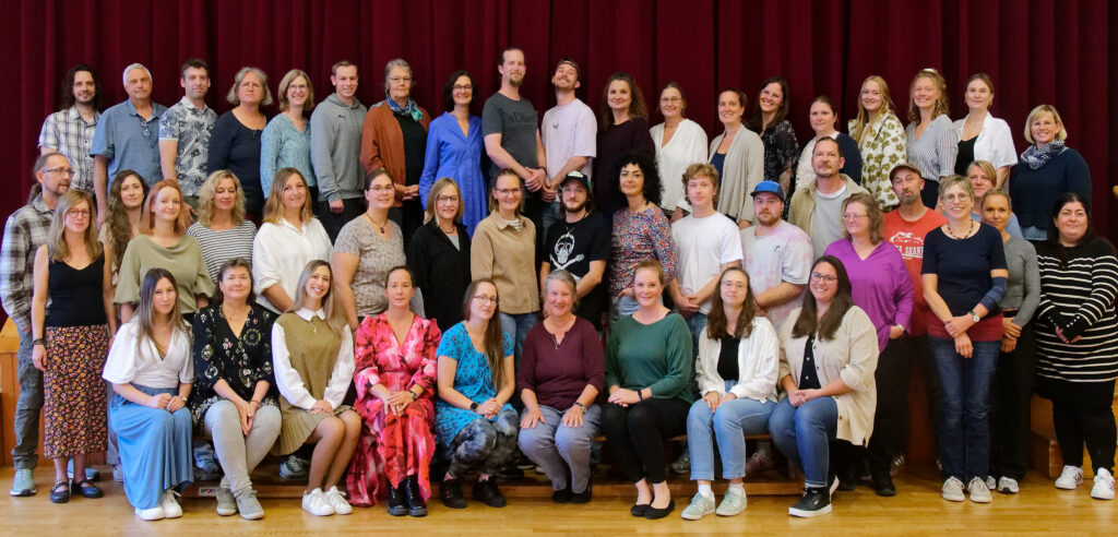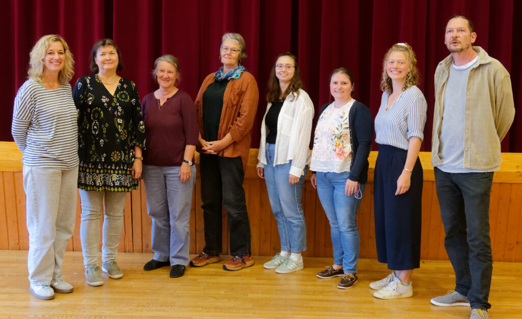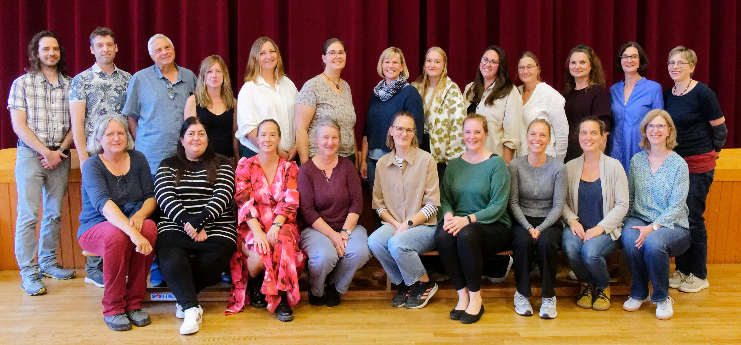 Unser Kollegium Führungsteam Ruth Stumpp (Geschäftsführung), Christa Müntnich (Leitung Heilpädagogische Tagesstätte), Julia Zenger (Leitung Heilpädagogische Tagesstätte) und Nina Stock (Schulleitung) Pädagogisches Personal Pädagogische Konferenz Lehrkräfte Fachkräfte Heilpädagogische Tagesstätte Fachdienst Kinderpfleger:innen Verwaltung Küchenpersonal Nadine Adams und Stefanie Röhricht Hausmeister Schulhund Struppi